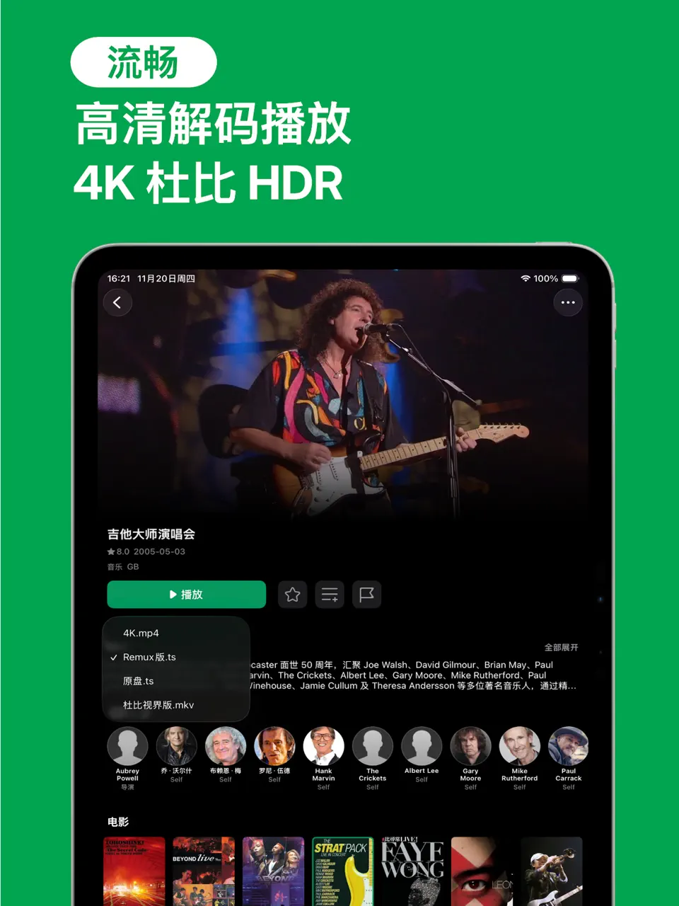 自动根据文件名匹配刮削获取电影美剧封面演员等信息,自动分类整理您的影视资源,支持一键全局搜索。同时拥有强大易用的播放功能,支持mp4/mkv/webm/avi/rmvb/wmv等几乎所有的视频格式。支持倍速,字幕,截图,HDR。